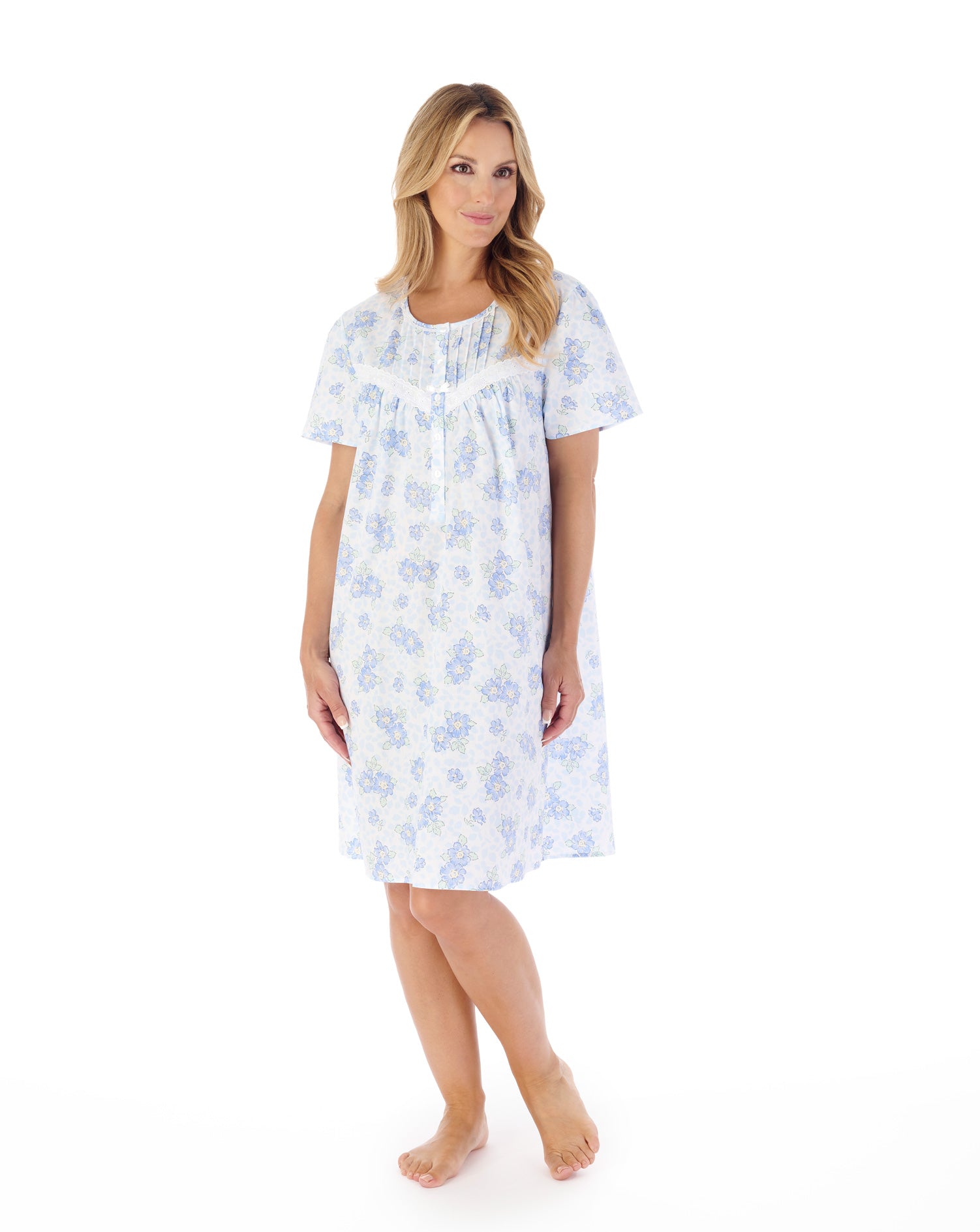 A stunning white nightgown with a pink or blue floral design throughout, designed with a angled V Yoke and pintuck detailing. Finished with a narrow broderie trim to the yoke...