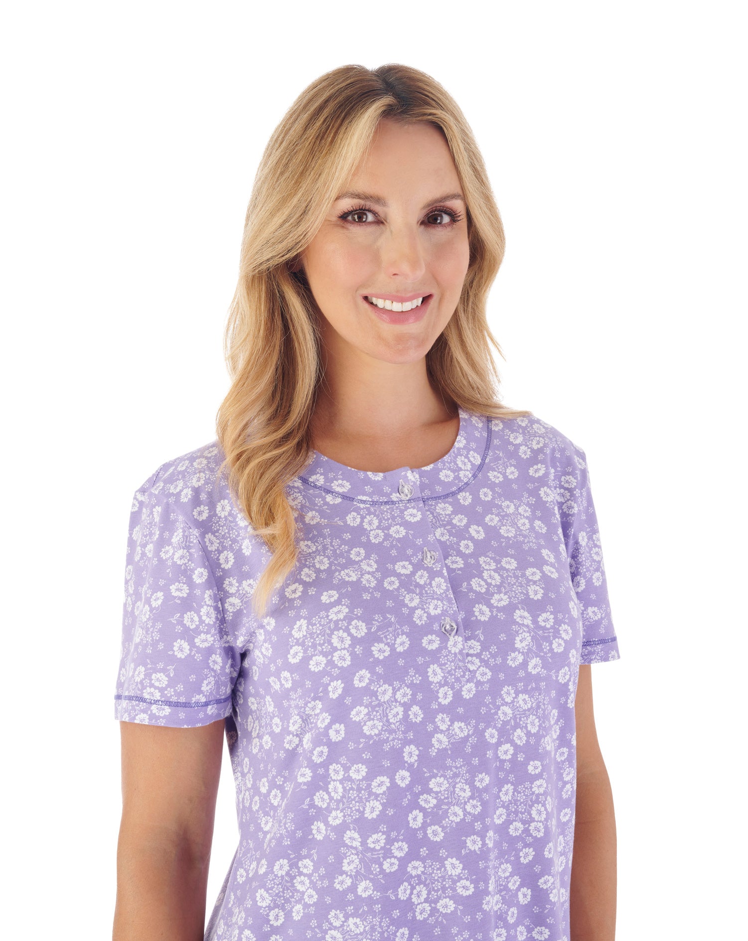 Our beautiful single colour floral print jersey nightdress is designed with a short sleeve with a button opening for ease with dressing. Finished with contrast stitch detailing. Perfect for the spring and summer nights.