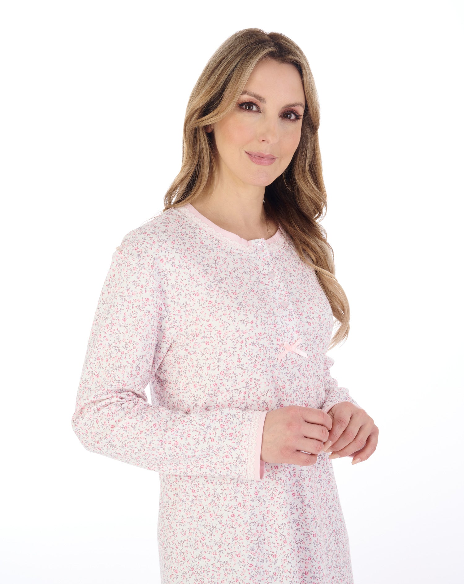 Experience maximum comfort and style with the 45" Floral Print Cotton Interlock long sleeve Nightdress. Crafted with 100% cotton interlock and featuring a 3-button placket, bow detail, and lace trim, this nightdress is designed for easy dressing and perfect for autumn. Enjoy a restful night's sleep or lounge in luxury!