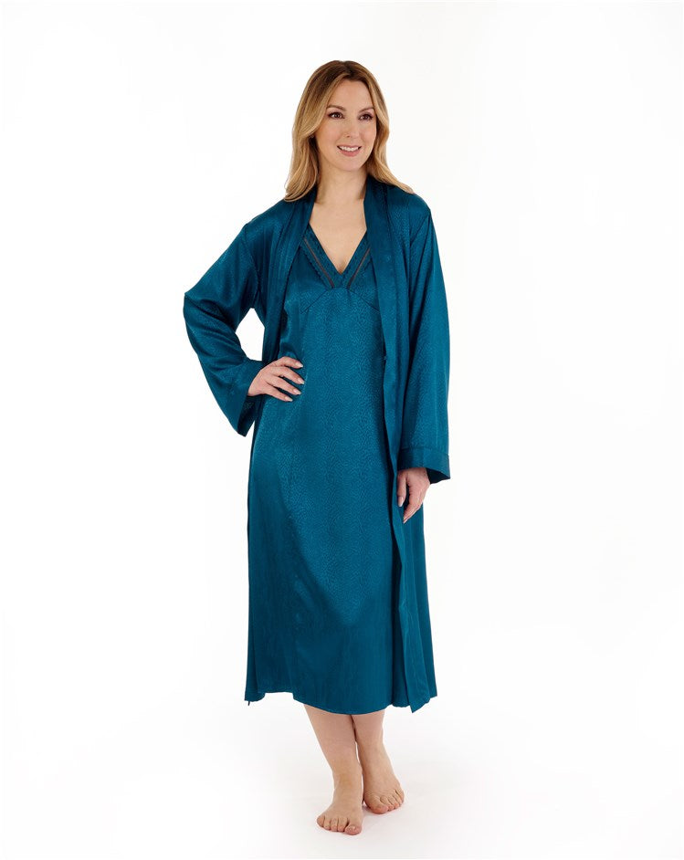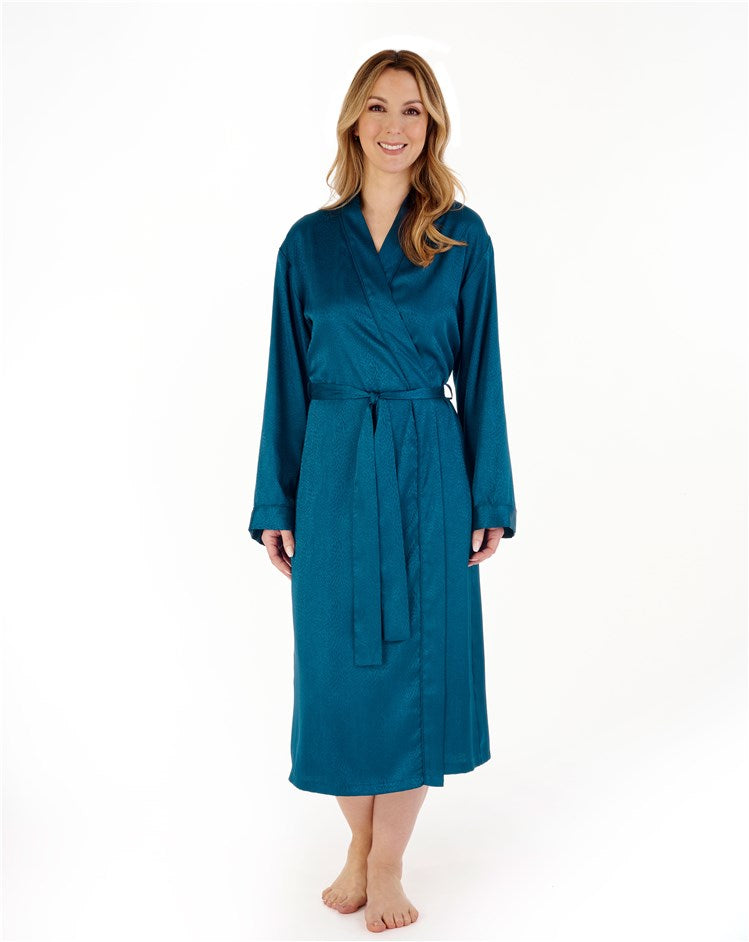 An elegant jacquard satin lightweight kimono with long sleeves, in a wrap style finished with a satin piping to the neck band and cuffs. Designed in a solid colour with...