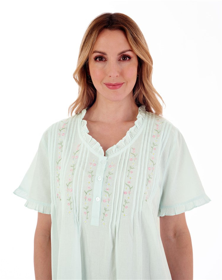 An elegant style nightdress measuring 42” in length is designed in a short sleeve style for comfort. Designed with pintuck detail to the front and coloured floral embroidery to the...