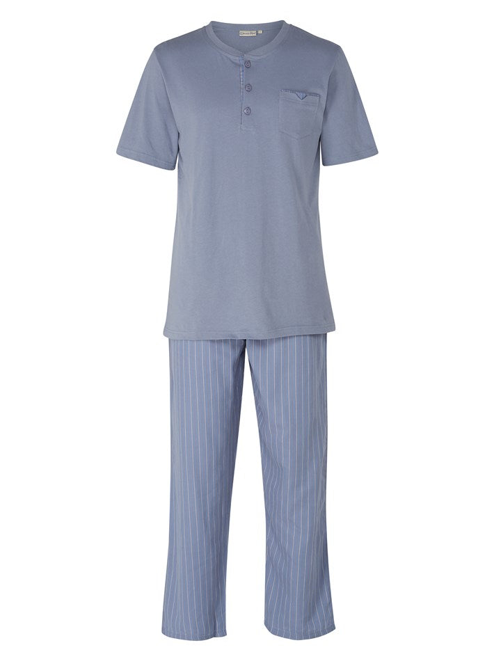 A classic mens style pyjama made from 100% Cotton. Short sleeve jersey t-shirt style top in a plain colour with co-ordinating printed long trouser. A perfect pyjama set for the spring season.